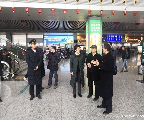 检查组一行首先来到徐州火车东站,现场查看了检票口、候车室客流及进站口服务情况,并对顺心服务台春运志愿者的工作给予赞扬。检查组详细询问了解了徐州东站春运期间的旅客组织情况,以及客流高峰时段应对措施。徐州站副站长许宁介绍了火车站针对今年春运期间多变的恶劣天气,优化进站口开放时间,以及为了实现“平安春运、有序春运、温馨春运”的目标,从人员上增派40余名安检辅助人员和64名武警,加强站区联动应急协调等举措。检查组对徐州东站的服务举措给予了充分肯定