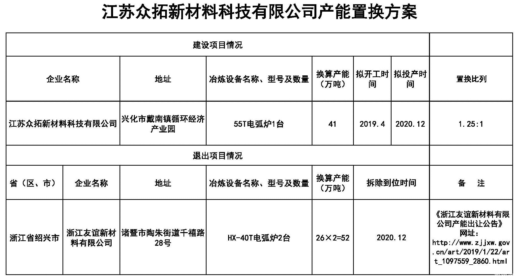 附:关于江苏众拓新材料科技有限公司炼钢项目产能置换方案的公告