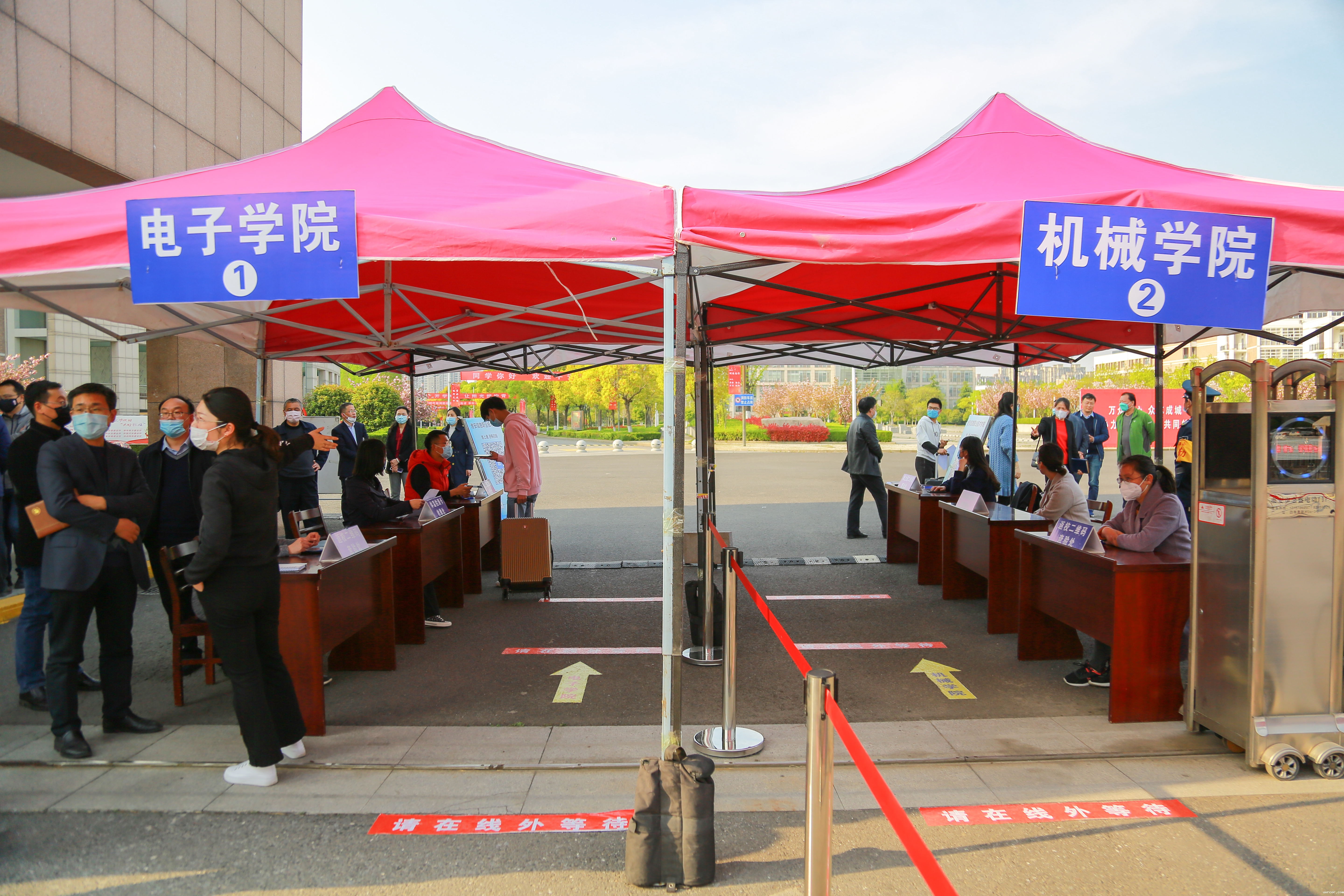近40名党员教师、辅导员、保安、医护人员、宿舍管理人员逐项演练了学生返校报到工作中涉及的“一测量体温、二扫返校码、三核验身份、四交健康承诺卡、五进寝室”5个环节工作流程,着重演练了出现学生发热等身体异常症状的应急处置。整个演练过程严肃、认真、有序,有效检验了学校既定工作预案。