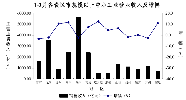 五、苏中、苏北地区营业收入实现正增长。一季度,苏南、苏中和苏北地区规模以上中小工业实现营业收入同比分别下降0.4%、增长2.3%和增长8.3%,苏南地区降幅比1-2月收窄5.1个百分点,苏中、苏北地区增速比1-2月回升2.1个和0.7个百分点;实现利润总额同比分别下降19.2%、18.7%和3.2%,与1-2月相比,苏南、苏中地区降幅分别收窄8.1个、4.7个百分点,苏北地区增速回落5.1个百分点。